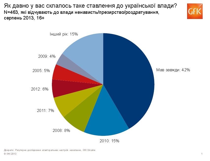 Одночасно зменшилася частка респондентів, які відчувають до влади страх та боязнь (з 8% у березні 2012 року до 4% у серпні 2013 року).