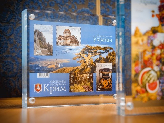 Нагадаємо, в 2013 р. Укрпошта започаткувала серію поштових марок «Краса і велич України», яка розпочалася випуском поштового блоку «Автономна Республіка Крим», на якому зображено Долину привидів (Димерджі), м. Алушта; церкву св. Іоанна предтечі, м. Керч; винні погреби Масандри; пеліку та панораму Південного берега Криму. У серії також випущено художні марки «м. Бахчисарай. Ханський палац», «Аю-Даг (Ведмідь-гора), смт Гурзуф. Південний берег Криму» та марка «м. Севастополь. Володимирський собор в Херсонесі».