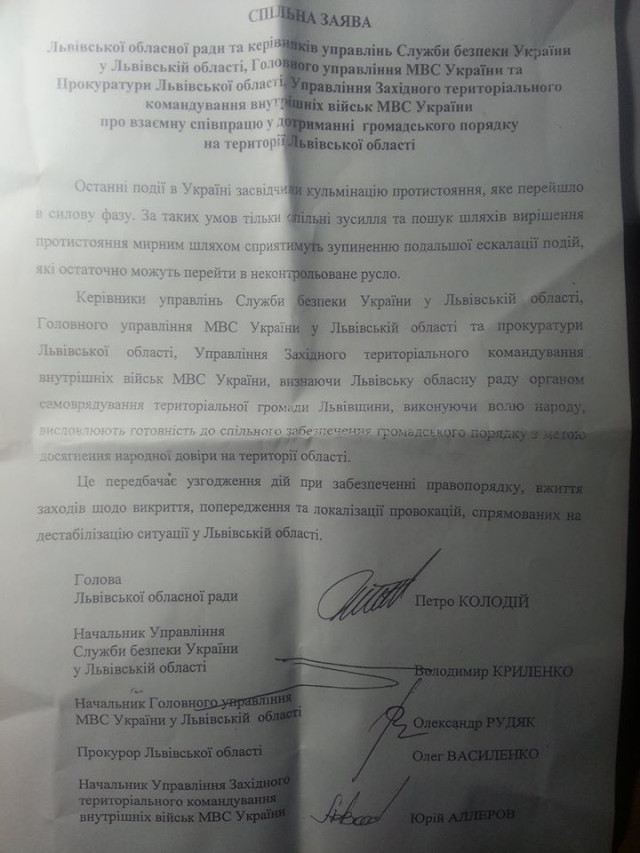 «Дуже важливий документ. Хто має змогу поширити і роздрукувати - зробіть це. Його варто вручати керівникам міліцейських і армійських підрозділів. МВС, СБУ, прокуратура і армія, дислокована на Львівщині, стали на бік Майдану і фактично визнали зверхність обласної влади. Не самі - їх до цього примусив народ», - написав він.