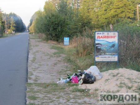 Від одного більшого стихійного сміттєзвалища неподалік невідомі утворили ще одне, менше, з пляшок з-під алкоголю та пакетів з відходами. Сміттєві мішки вже встигли порозривати та порозносити довкола бродячі собаки.
