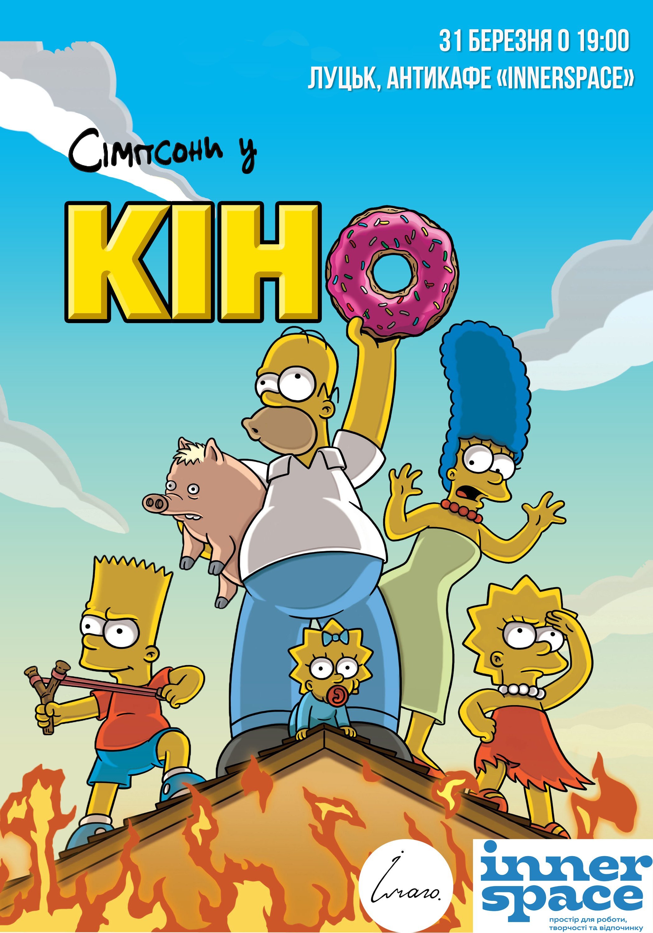 Сьогодні, 31 березня, о 19:00 в антикафе «Innerspace», що за адресою вулиця Паркова, 5, розпочнеться благодійний кіноперегляд повнометражного мультиплікаційного фільму «Сімпсони у кіно» режисера Девіда Сільвермена, знятого на основі комедійного мультиплікаційного телесеріалу «Сімпсони». Тривалість фільму - 87 хвилин.