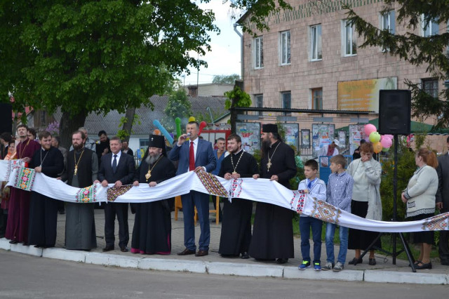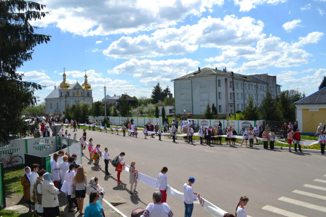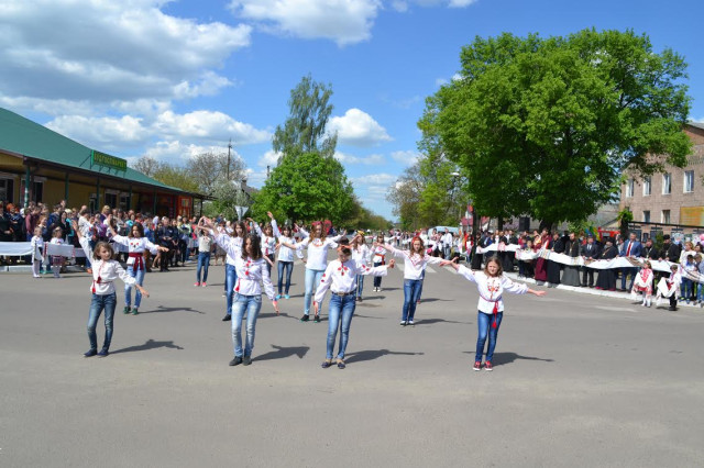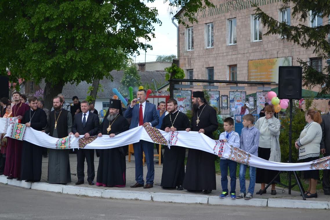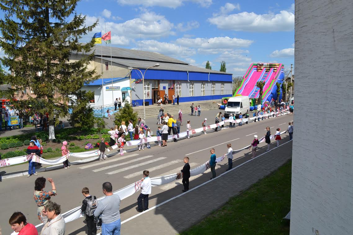 О 12.00 годині мешканці зібралися у центрі селища для флеш-мобу «Оберіг рушниковий». Дорослі й діти принесли рушники і з них утворили єдине полотно у формі хреста, розмістившись на перетині вулиць. Учасників акції привітали танцем учні НВК «ЗОШ I-III ступенів – гімназія» селища міського типу Голоби імені С. Є. Ткача.
