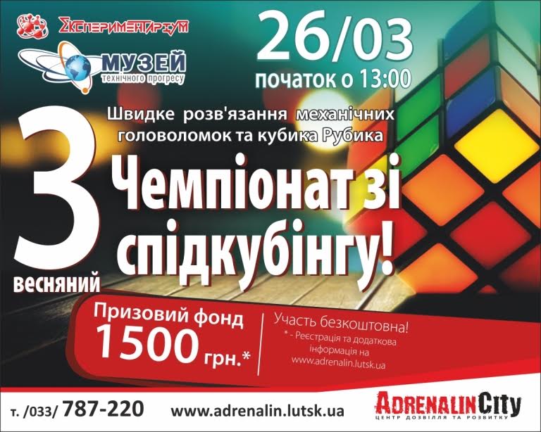 Вже втретє у Луцьку відбудуться змагання зі швидкісного складання кубика Рубика – спідкубінгу. Під час чемпіонату учасникам також пропонуватимуть розв’язати механічні головоломки на швидкість.