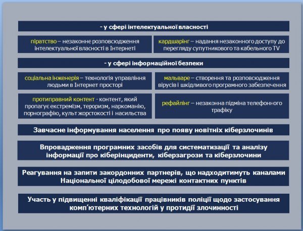 2. Протидія кіберзлочинам: у сфері використання платіжних систем, у сфері електронної комерції та господарської діяльності, у сфері інтелектуальної власності, у сфері інформаційної безпеки.