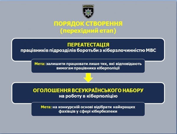 Міністр внутрішніх справ України заявив, що старт набору в кіберполіцію і детальні умови конкурсу будуть оголошені з 15 жовтня. З 26 жовтня розпочнеться атестатаційний конкурс для всіх майбутніх кіберполіцейських. До 5 листопада штат кіберполіції буде сформовано і почнеться завершальний перехідний етап вибудовування нового функціоналу кіберполіції та перепідготовки персоналу на марші.
