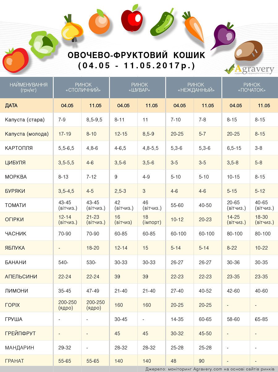 Кілограм картоплі можна придбати за 4-6 грн. Вартість капусти коливається в межах 8-12 грн, моркви – 6-10 грн, цибулі – 3-5 грн, а за кілограм буряка доведеться віддати від 2 до 3 із половиною гривень.Зауважимо, ціни на овочі в Україні в січні-березні 2017 року були на 11 відсотків вищі в порівнянні з аналогічним періодом 2016 року.