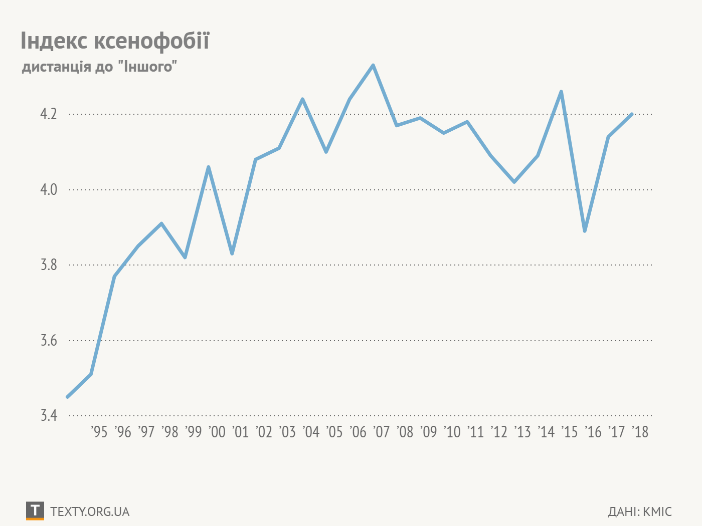 Рівень ксенофобії в Україні падав починаючи з 2007 року, проте знову починає зростати - свідчать дані Київського міжнародного інституту соціології. КМІС проводить подібні дослідження багато років поспіль, повідомляють Тексти.