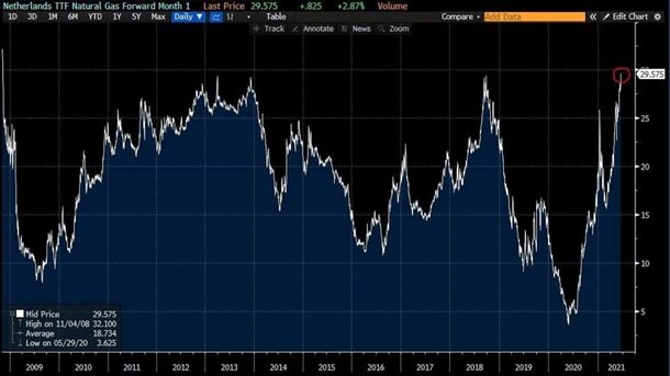 «Вартість газу на європейському хабі TTF досягла 13-річного максимуму», – повідомив Макогон і опублікував відповідний графік.