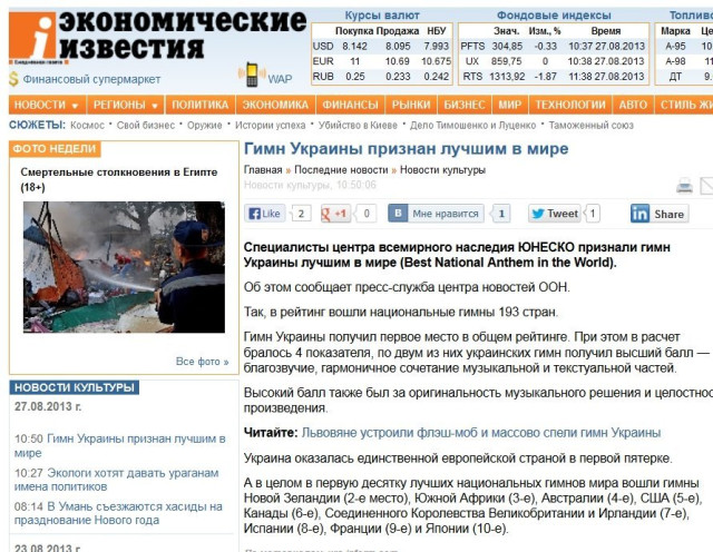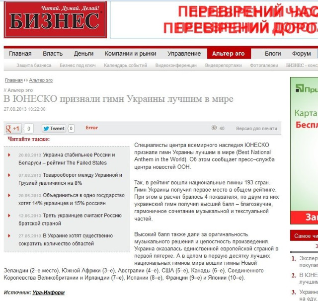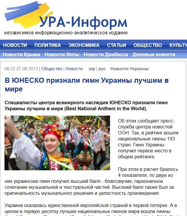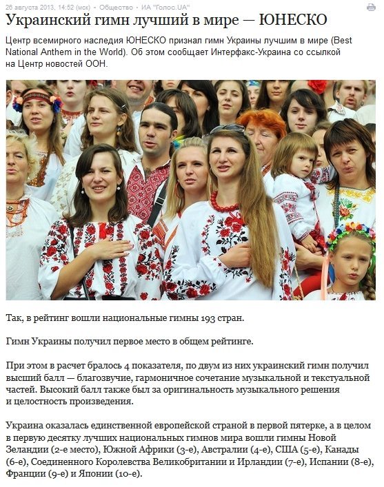 В ЮНЕСКО український гімн назвали кращим у світі. ФЕЙК. ФОТО