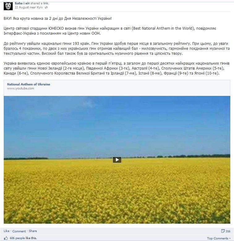 Відгукнувся лише адміністратор сторінки «Баба і Кіт». Вони ж і розмістили новину про гімн: