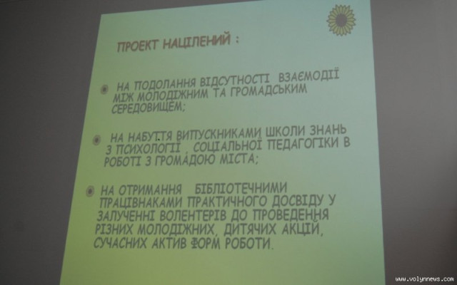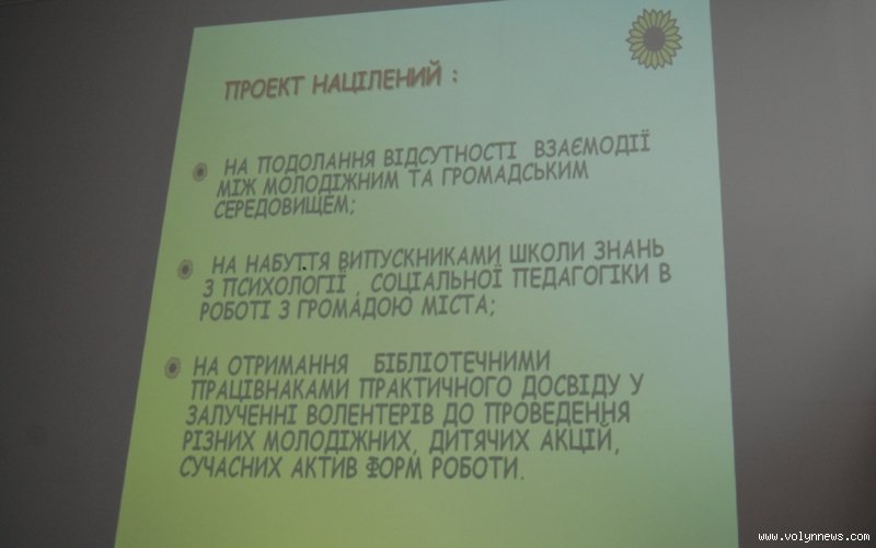 Як розповіла під час прес-конференції 18 липня заступник директора по роботі з дітьми луцької центральної бібліотеки для дітей Ніна Бочарова, у рамках проекту на базі інтернет-центру міської дитячої бібліотеки організують спеціальні навчання для молодих лідерів.