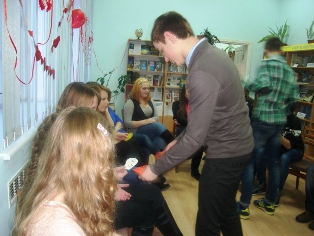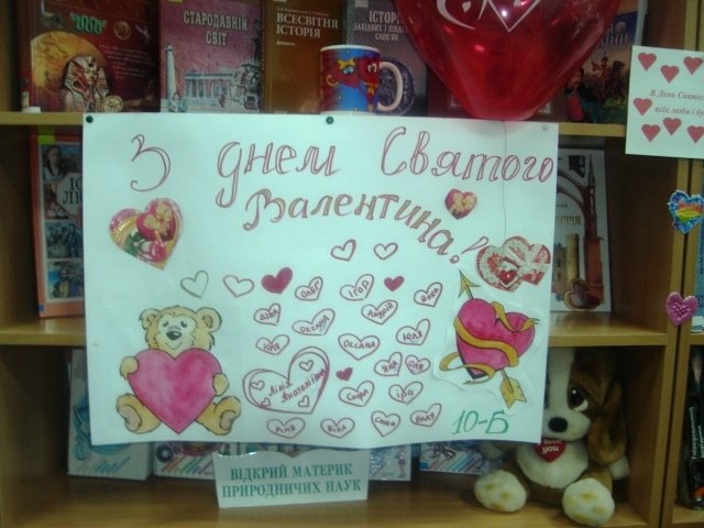 Учні 10-Б класу ЗОШ №15, які відвідали цей захід почули про передісторію свята Валентина, його традиції, поговорили на тему кохання. Також бібліотекарі підготували для учнів різноманітні конкурси, вікторини, веселі пізнавальні забави з визначенням найголовнішого серцеїда класу (поїдання на швидкість печива у вигляді сердечок), малювання святкового букету для дівчат, проголошення найприємніших слів із вуст дівчат для своїх однокласників, поєднання один з одним імен закоханих із світової літератури, визначенням ідеалу сучасної жінки.