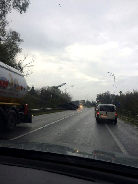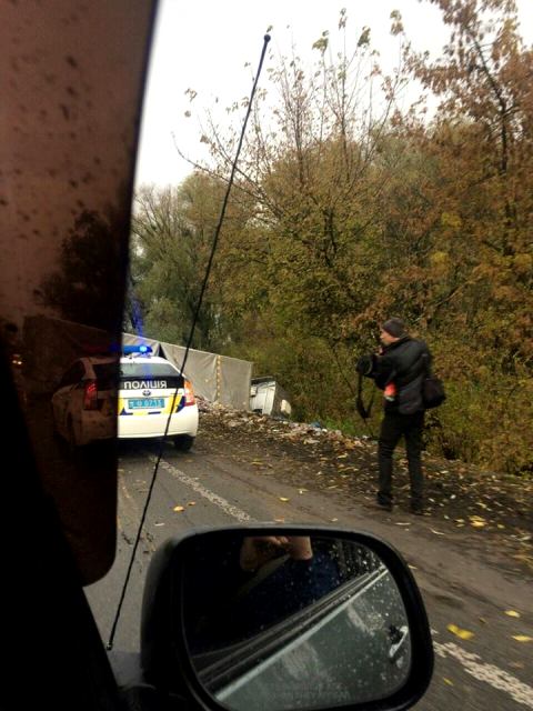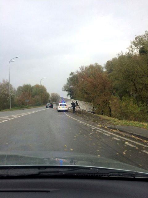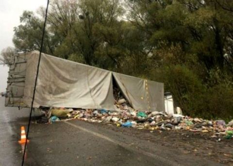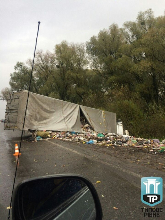 Згідно з інформацією очевидців, фура має львівські номери. В результаті аварії сміття вивалилося на проїжджу частину і узбіччя.