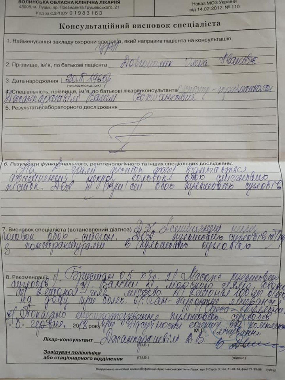 «Ще недавно ця жінка вела досить активний спосіб життя, ходила на роботу, піклувалася про сім'ю, раділа кожному дню, як нормальна здорова людина. А тепер усе, як у страшному сні… Спочатку боліли ноги, потім стали в допомогу милиці – діагноз «асептичний некроз головок обох стегон, lll-стадія». І тепер без допомоги інших майже нічого не може сама робити. Виправити становище може операція, але коштує вона понад 100 тисяч гривень – і це тільки заміна одного суглоба! Сума для сім'ї не підйомна, тому просимо допомогти усіх не байдужих громадян до чужого горя! Чашка випитої кави сьогодні коштує 20 грн, і непомітна для бюджету, а для цієї сім'ї може допомогти», – йдеться в дописі Наталії Рудики-Колібабчук.