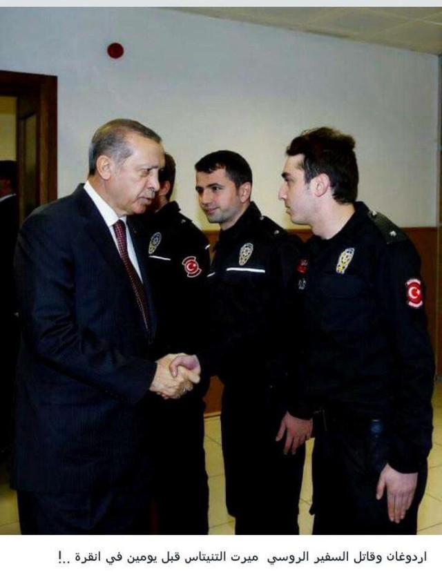 Ресурс Kurdistan insider опублікував фотографію, на якій президент Туреччини Реджеп Ердоган вручає нагороди поліцейським, серед яких був вбивця російського посла в Туреччині Андрія Карлова. Це 22-річний Мевлют Мерт Алтинташ.