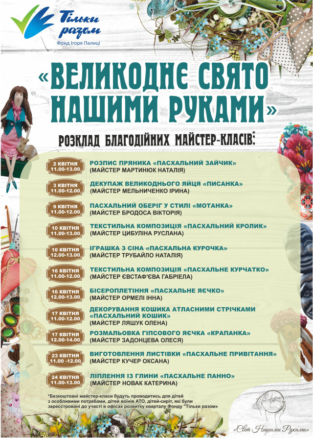Протягом квітня за сприяння Фонду Ігоря Палиці «Тільки разом» щосуботи та щонеділі відвідувачі арт-галереї матимуть змогу створити подарунок до Великодня і наблизити відчуття світлого свята, - інформує прес-служба Фонду.