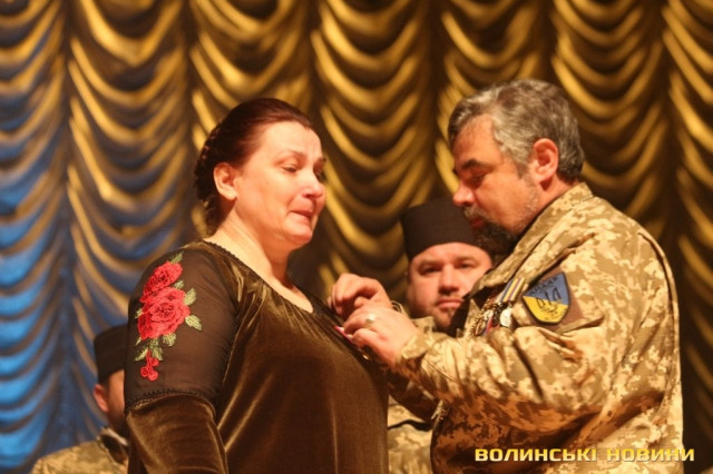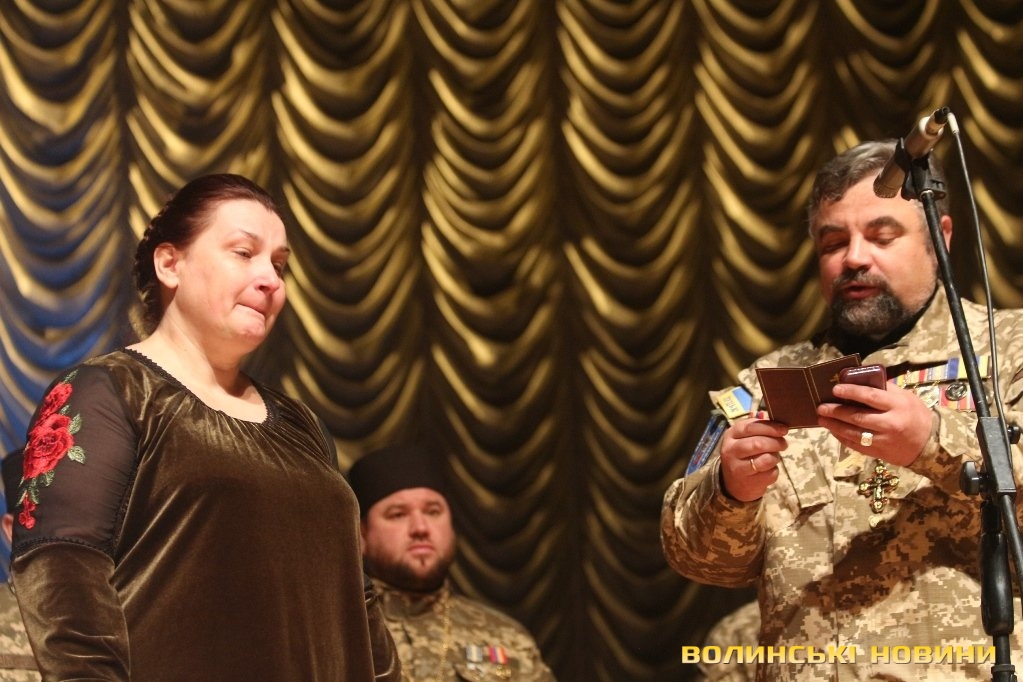 Голова ГО «Військові капелани Волині» протоієрей Михайло Бучак вручив Любові Карабан медаль «За жертовність і любов до України» від патріарха Київського і всієї Руси-України Філарета.Після завершення вечора учасники заходів поклали квіти до фотостенду «Герої Небесної Сотні. Загинули за єдність України».