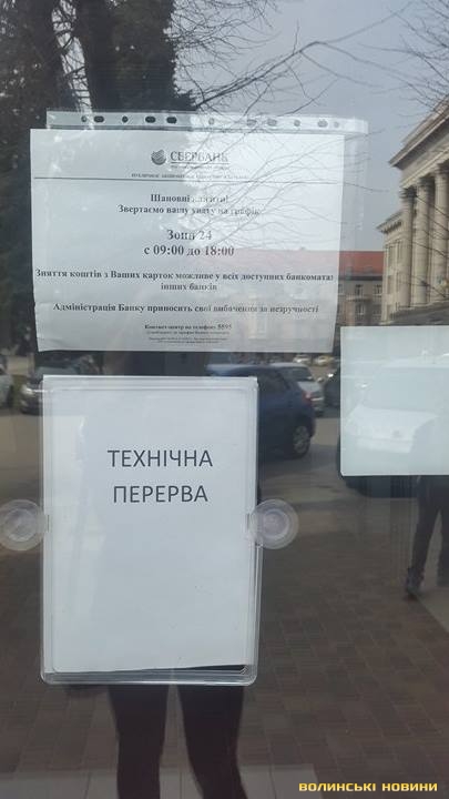 Відділення Сбербанку, яке знаходиться по сусідству, на проспекті Волі, 11, досі зачинено на «технічну перерву». Проте менеджер відділення запевняє, що банк відновить свою роботу вже сьогодні.