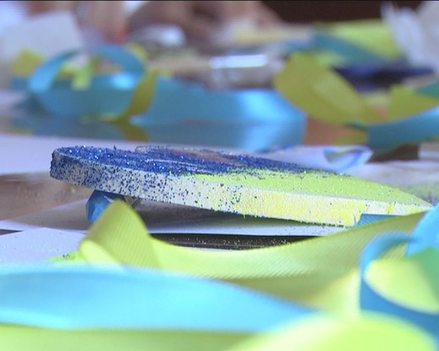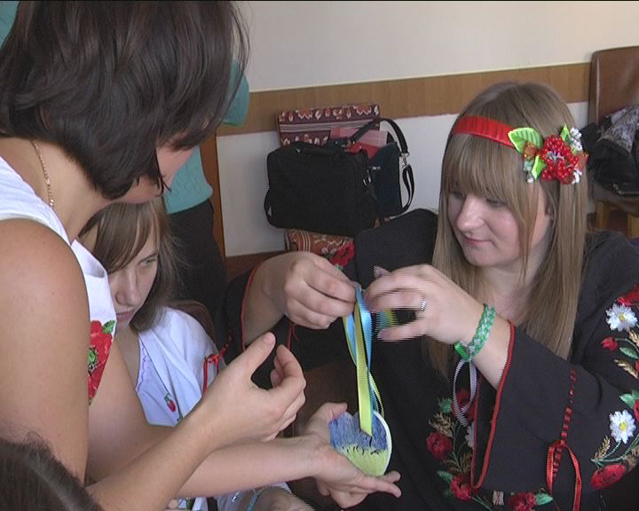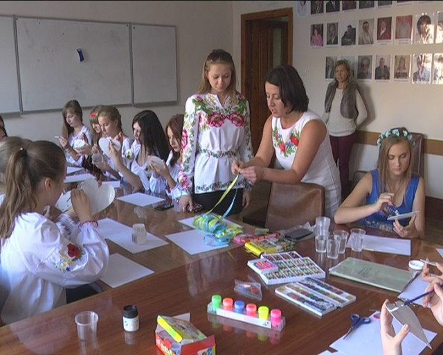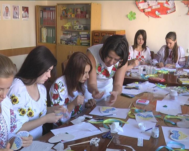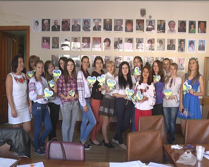 Студенти першого курсу, вбрані у вишиванки, виготовляли патріотичні сувеніри для бійців, котрі нині захищають рубежі нашої країни. До кожного сердечка, розфарбованого в синьо-жовті кольори, учасниці майстер-класу прикріпили листівки з побажаннями військовослужбовцям.
