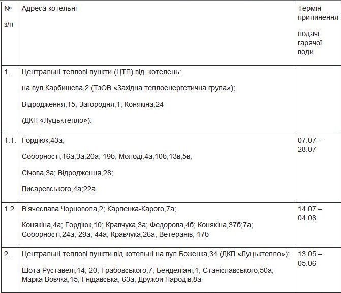 Адміністрація ДКП «Луцьктепло» інформує лучан, які отримують послуги з централізованого гарячого водопостачання, про відключення гарячої води згіднографіка.