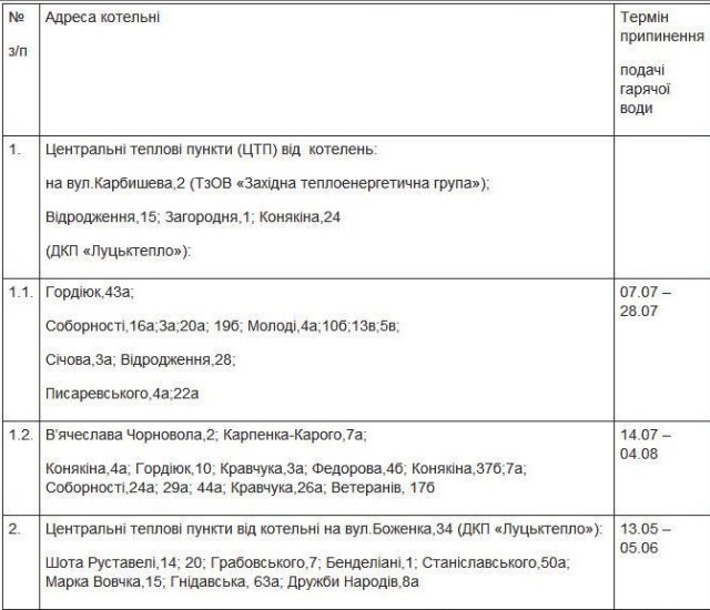 У зв’язку з необхідністю проведення у 2014 році профілактичного ремонту теплових мереж затверджено графік припинення подачі гарячої води від котелень, центральних теплових пунктів державного комунального підприємства «Луцьктепло» та Товариства з обмеженою відповідальністю «Західна теплоенергетична група».
