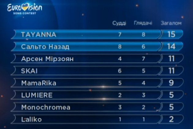 Після виступів учасників ведучий Сергій Притула розкрив оцінки глядацького голосування.Суддями конкурсу стали Джамала, Костянтин Меладзе та Андрій Данилко.За результатами суддівських оцінок і глядацького голосування в першому півфіналі національного відбору на "Євробачення-2017" перемогли двоє учасників - співачка TAYANNA і група "Сальто Назад".Зауважимо, стала відома вартість квитків на конкурс.