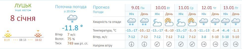 10 січня у Луцьку очікується від 8 до 10 градусів нижче нуля, а вже 11 січня вдень буде не холодніше 5-ти градусів з позначкою «мінус». Швидкість вітру ці дні буде незмінною.