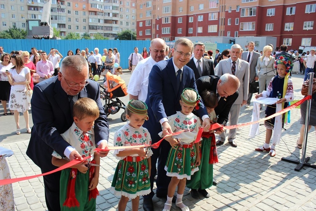 Опісля привітань новоселів та вручення їм сертифікатів та ключів від нових квартир, Олександр Вілкул та Борис Клімчук разом із 4 малюками перерізали стрічку біля одного з під’їздів будинку.