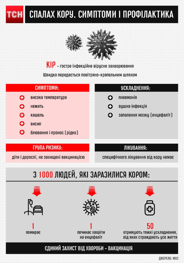 Специфічного лікування від кору немає. Єдиний засобом профілактики і захисту від хвороби наразі лишається вакцинація. Тому батьків закликають якнайшвидше щепити свою дитину.