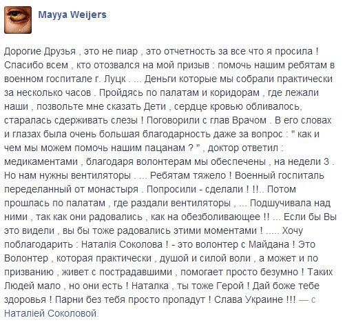 «Силами волонтерів для поранених завезено 3 телевізори, 2 холодильники, 7 вентиляторів. Щира подяка Sonja Smile, Наталі Толмачовій, Ігорю Антонюку, Лілії Лащук, Адвокат Луцк, дівчата з Нововолинська. Працівники Старого Ринку принесли фрукти, зібрали кошти на ліки. Наталия Шепель з друзями, Мирослава Козань, подяка від хлопців за смачненьке. Цибульському В.І. Окрема подяка за гроші на ліки.