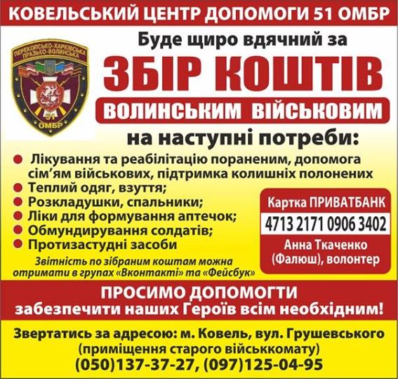 Ковельський центр допомоги 51 ОМБ закликає усіх небайдужих волинян допомогти наших військовим. Про це інформують волонтери в мережі.