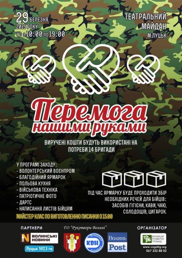 Нагадаємо, що ярмарок «Перемога нашими руками» є благодійним. Його метою є ознайомлення жителів міста з проблемами військового забезпечення волинських солдатів, виховання почуття поваги до українських військових, збір коштів, амуніції й іншої допомоги для забезпечення потреб 14-ої механізованої бригади.