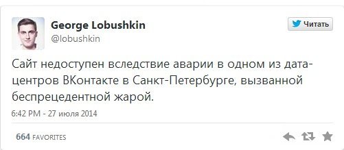 «Сайт недоступний внаслідок аварії в одному з дата-центрів ВКонтакте в Санкт-Петербурзі, викликаної безпрецедентною спекою», - написав у неділю ввечері Лобушкін. Спочатку стали недоступними частина розділів соцмережі, проте згодом «ліг» і весь сайт.