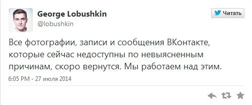 «Усі фотографії, записи та повідомлення ВКонтакте, які зараз недоступні з нез'ясованих причин, скоро повернуться. Ми працюємо над цим», - пояснив прес-секретар «ВК».