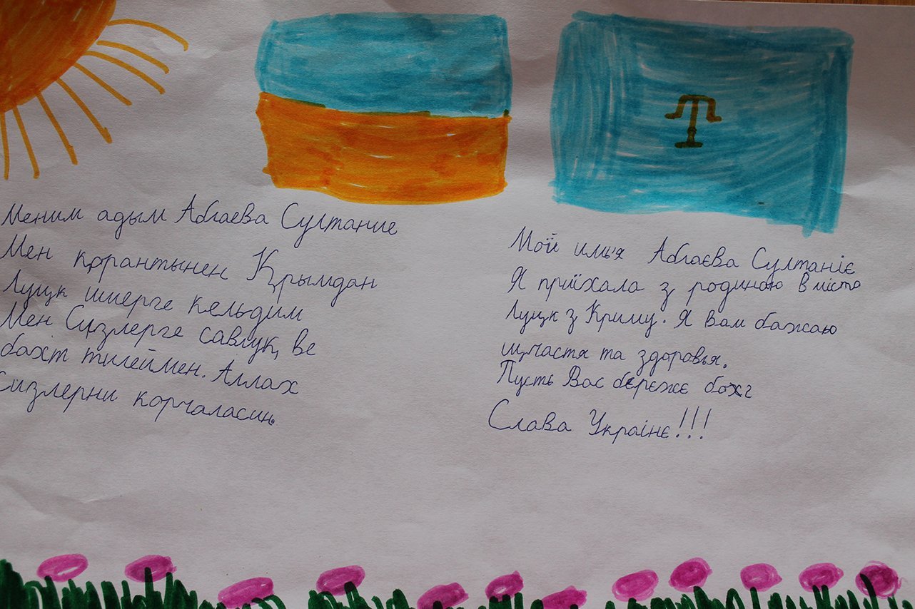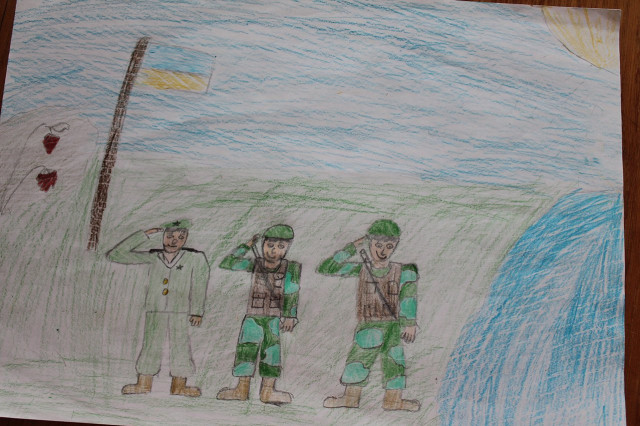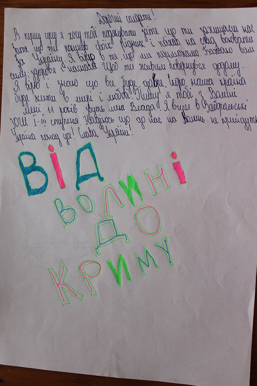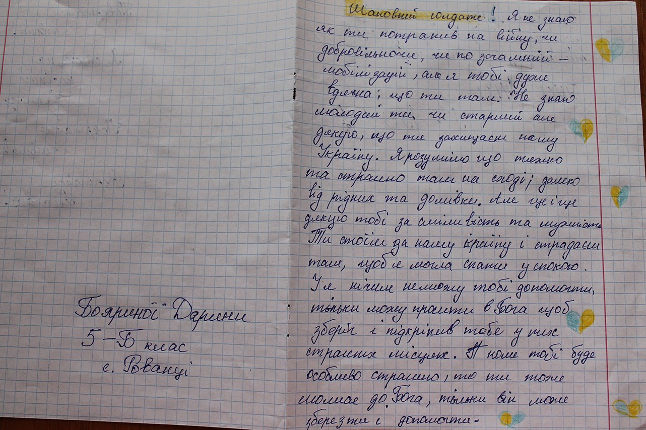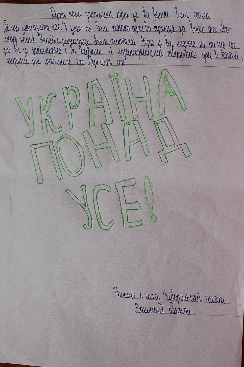 Учениця 6 класу Заборольської школи пише солдатам: “Дорогі наші захисники, перш за все велике вам спасибі, що захищаєте нас. Я знаю, як вам нелегко, адже ви боретеся за волю та свободу нашої України, ризикуючи власним життям. Вірю у вас, надіюся на те, що скоро все це закінчиться, і ви живими й неушкодженими повернетеся уже в такий мирний та спокійний час. Бережіть себе. Україна понад усе!