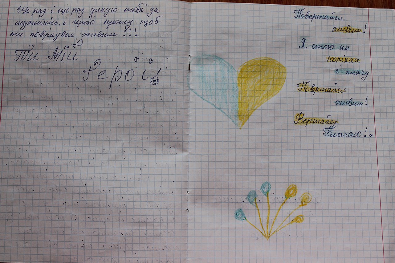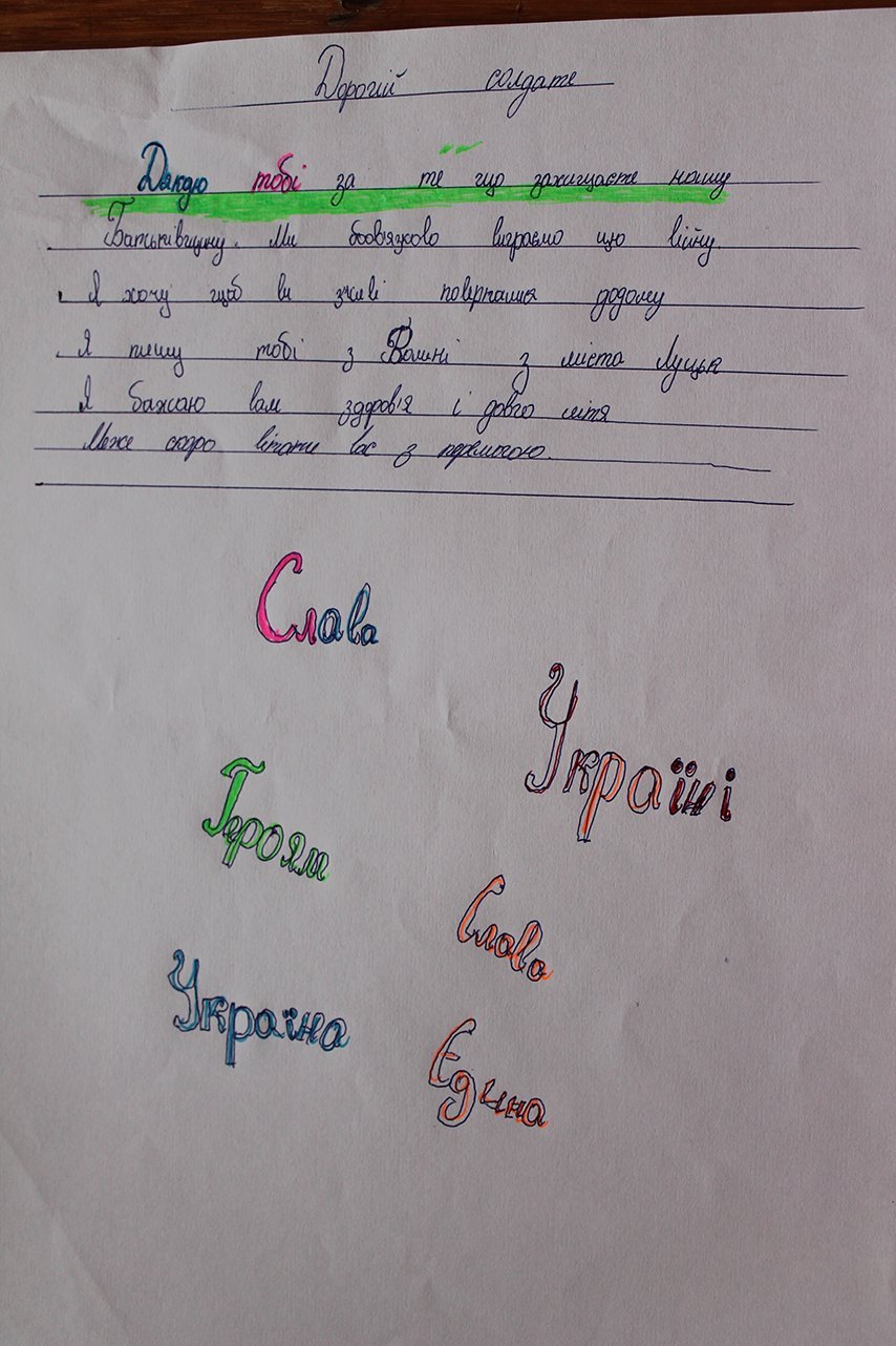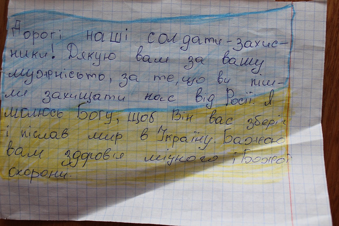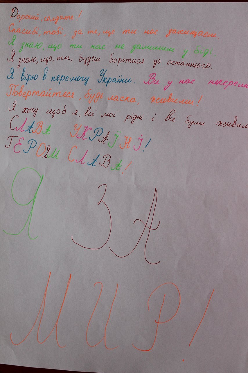 “Дорогий солдате! Спасибі тобі за те, що нас захищаєш. Я знаю, що ти нас не залишиш в біді. Я знаю, що ти будеш боротися до останнього. Я вірю в перемогу України. Ви у нас непереможні. Повертайтеся, будь ласка, живими. Я хочу, щоб я, всі мої рідні і ви були живими. Слава Україні. Героям Слава”, – пише школяр в своєму листі.