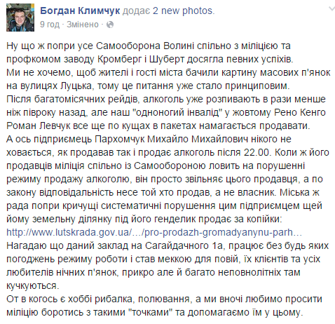 Активіст стверджує, що коли міліція спільно із Самообороною ловить на порушенні режиму продажу алкоголю його заклад, чоловік просто звільняє продавця, який реалізував алкоголь. Цікаво, що, згідно з законом, відповідальність несе той, хто продав, а не власник.