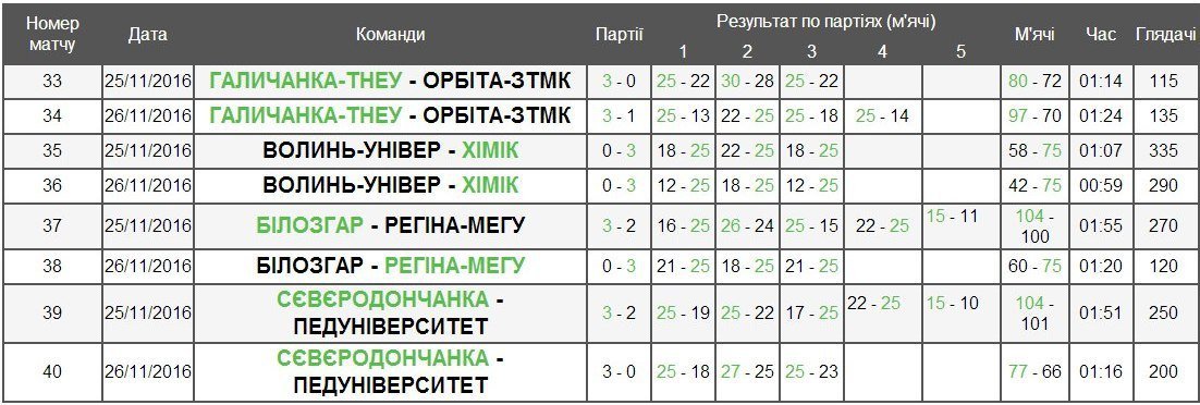В інших матчах туру «Северодончанка» взяла 5 очок у домашніх іграх з чернігівським «Педуніверситетом» - 3:2, 3:0. «Галичанка» в Тернополі програла лише одну партію запорізькій «Орбіті» - 3:0, 3:1. А вінницький «Білозгар» та рівненська «Регіна» обмінялися перемогами – 3:2, 0:3.