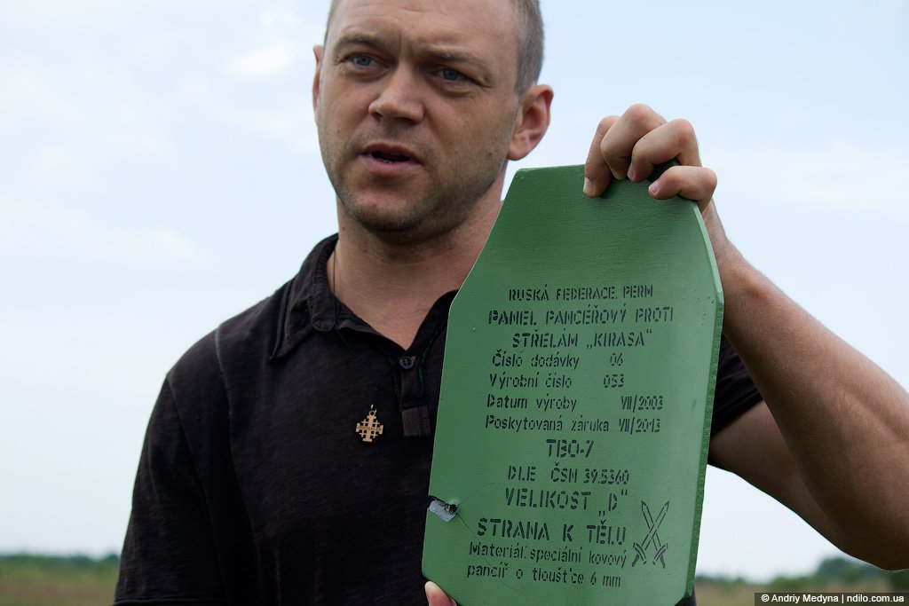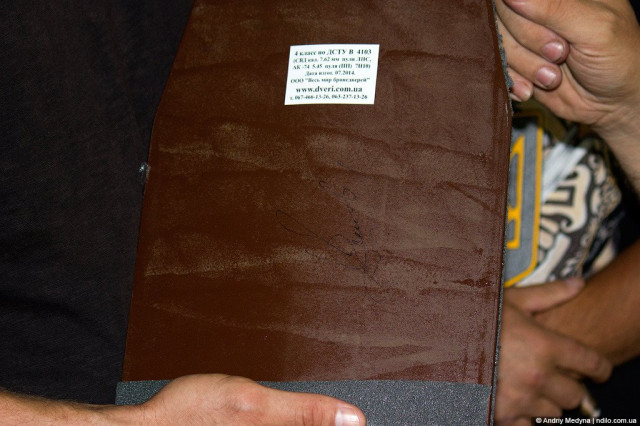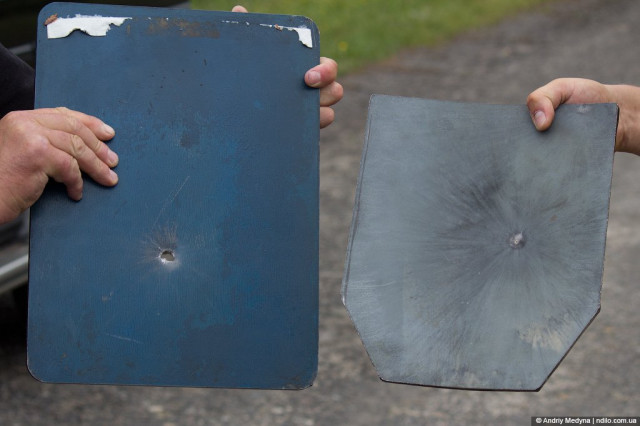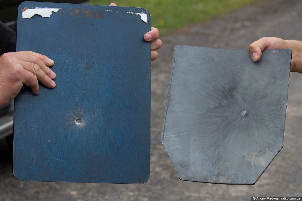 Дві пластини сертифікованого виробника «Бронедвері» 4 рівня захисту закріпили на узвишші. За сто метрів снайпер зарядив гвинтівку Драгунова патроном калібру 7,62 мм. Пролунав залп. Потім другий. В надії побачити втішний результат за пластинами побіг очільник ГО «Волинські патріоти» Володимир Красуля та Андрій Рязанов. Результати були шокуючими. В першому випадку куля пройшла навиліт, а у другому – зробила дірку, загнувши пластину всередину. - Обидва випадки смертельні для власника такого жилета, - підсумовує комбат Сергій Козак.