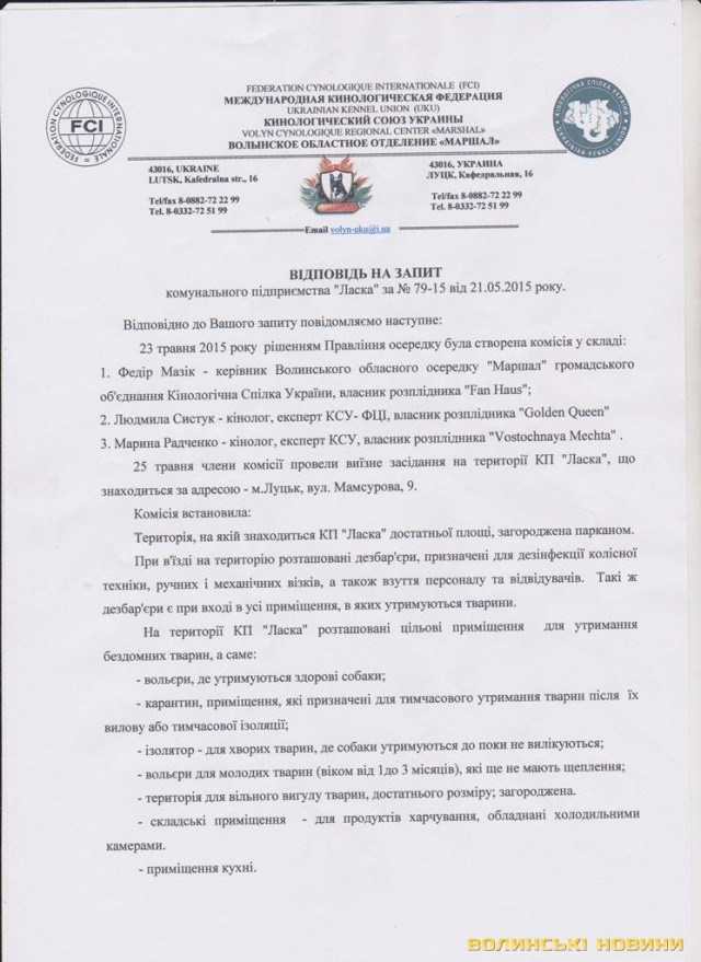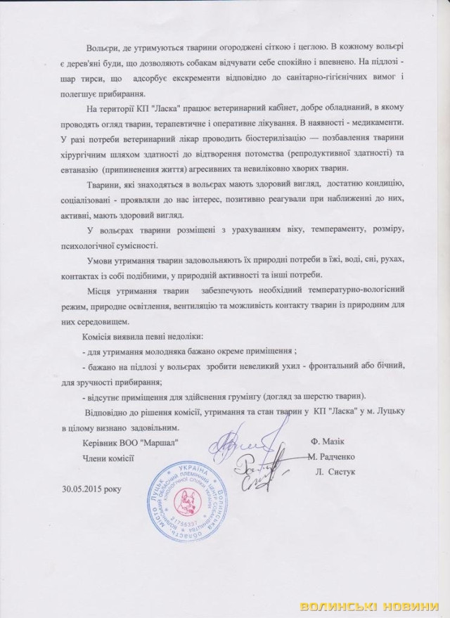 В цілому члени комісії були задоволені роботою КП «Ласка» та утримання тварин на цій території. Крім того, комунальне підприємство «Ласка» постійно перевіряють відповідні інстанції: управління ветеринарної медицини у місті Луцьку (планово та не планово), правоохоронні органи, прокуратура та фінансова інспекції – жодного разу порушень не виявили.