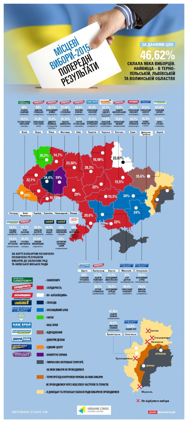На Волині найбільше голосів віддали за партію УКРОП. Крім того, у Луцьку та Дніпропетровську в другий тур виборів мера виходять представники цієї політсили. Зокрема, кандидат на посаду Луцького міського голови від партії УКРОП Олександр Товстенюк набрав 31,8% голосів. Своєю чергою, Борис Філатов отримав 35,3% на виборах мера.
