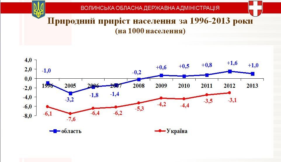 Торік природний приріс населення області становив +1 на тисячу осіб. Позитивну динаміку на Волині фіксують, починаючи з 2008-ого року. У порівнянні зі статистикою в державі, наш край на 4 сходинки вище середньостатистичного показника. Загалом же в Україні людей помирає більше, ніж народжується.