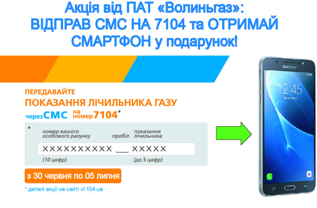 «Волиньгаз» дарує смартфон за смс із показанням лічильника на № 7104*