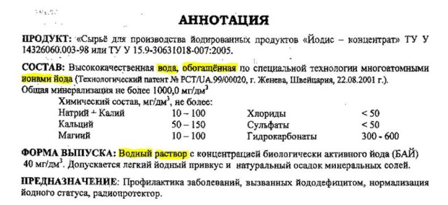 Відповідно до технічної документації, препарат являє собою звичайну воду, яка штучно насичена йодом. Випускається у пляшках, місткістю 0,5 літра.Члени профільної комісії заявили, що інформацію про препарат спрямують на управління охорони здоров’я, аби вони знали про цю біологічно активну добавку. Проте підкреслили, що розгляд таких питань - не в компетенції комісії.