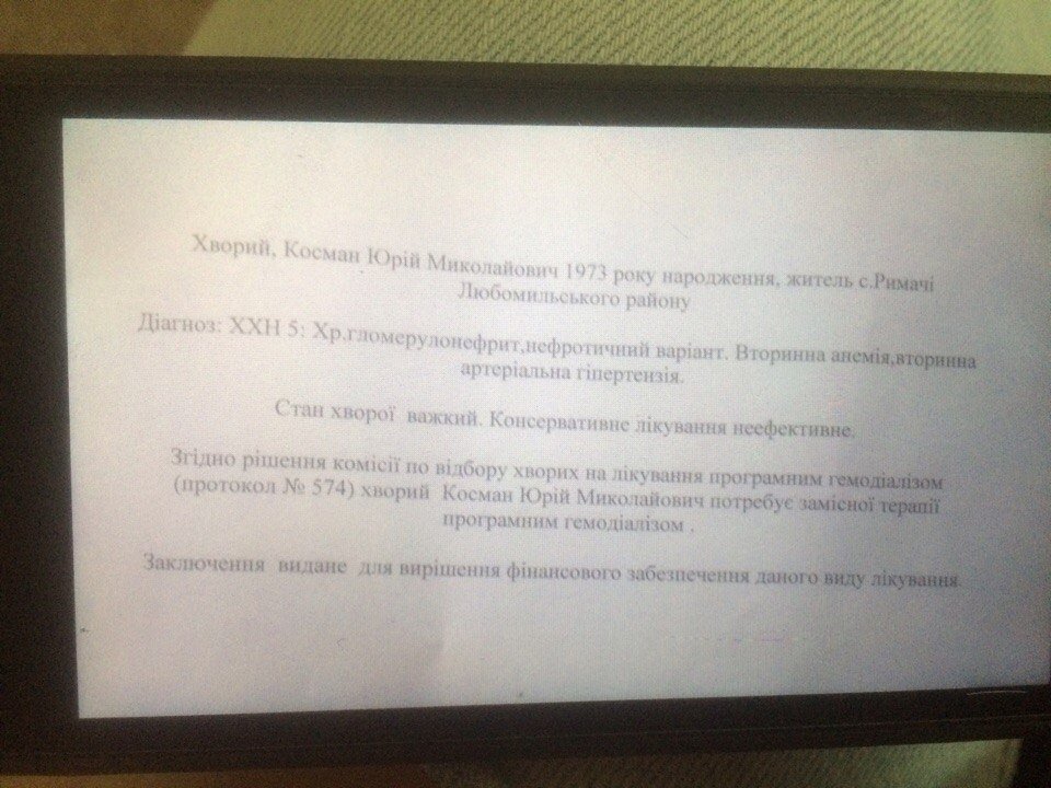 «Пишу до Вас із надією в серці і з великим сподіванням, що мене почують. Прошу не за себе, а за тата, Юрія Миколайовича Космана, 1973 року народження, житель с.Римачі Любомльського району. Діагноз: хр. гломерулонефрит, нефротичний варіант. Вторинна анемія, вторинна артеріальна гіпертензія. Стан мого тата - важкий. Консервативне лікування неефективне. Потрібна трансплантація нирки. Операція коштує 300000 гривень», - йдеться у повідомленні.