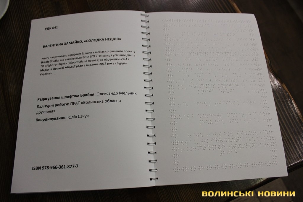 Книгу Валентини Хамайко “Солодка неділя”, яку перевидали шрифтом Брайля, презентували в Луцьку. Це перша книга для незрячих на Волині, за допомогою якої можна готувати страви.