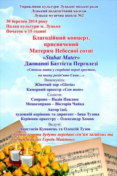 У Луцьку відбудеться благодійний концерт, присвячений матерям героїв «Небесної сотні». Організатори кажуть, що кошти, зібрані під час заходу, передадуть сім’ям загиблих та постраждалим Героям Майдану.