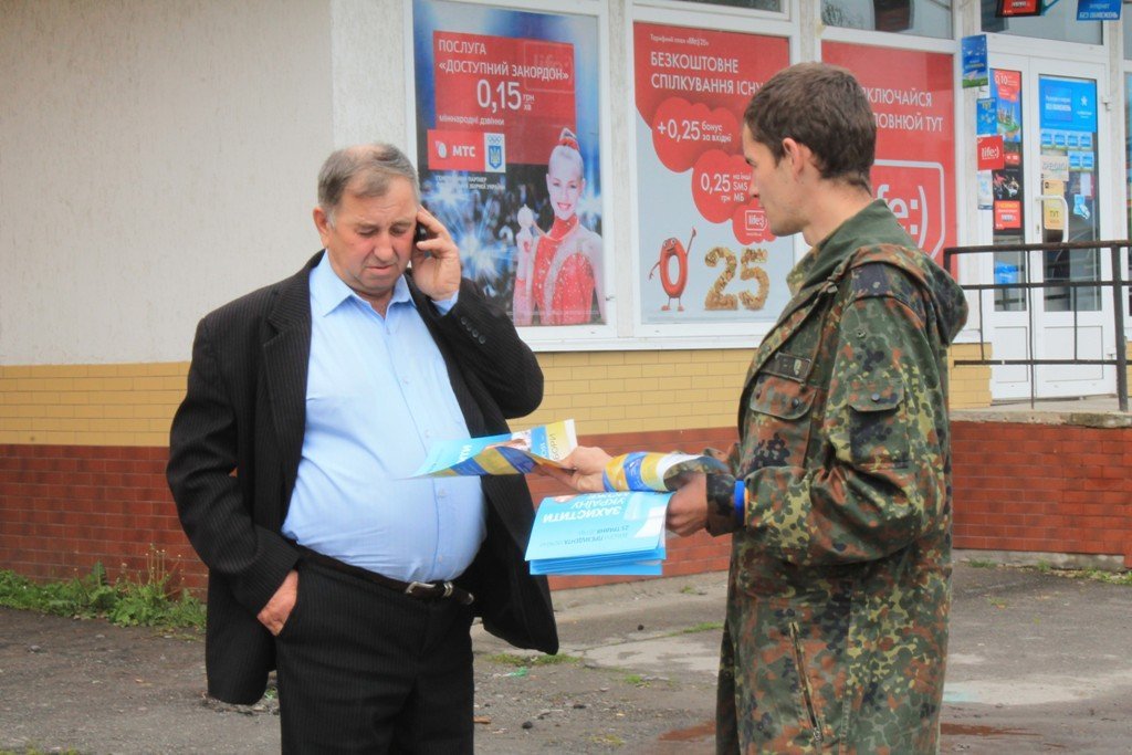 Виборцям поширювали флаєри із корисною для них інформацією (номер телефону гарячої лінії, час роботи виборчих дільниць, строки перевірки себе у списку виборців тощо), стрічки із символом прапора України та прапорці.