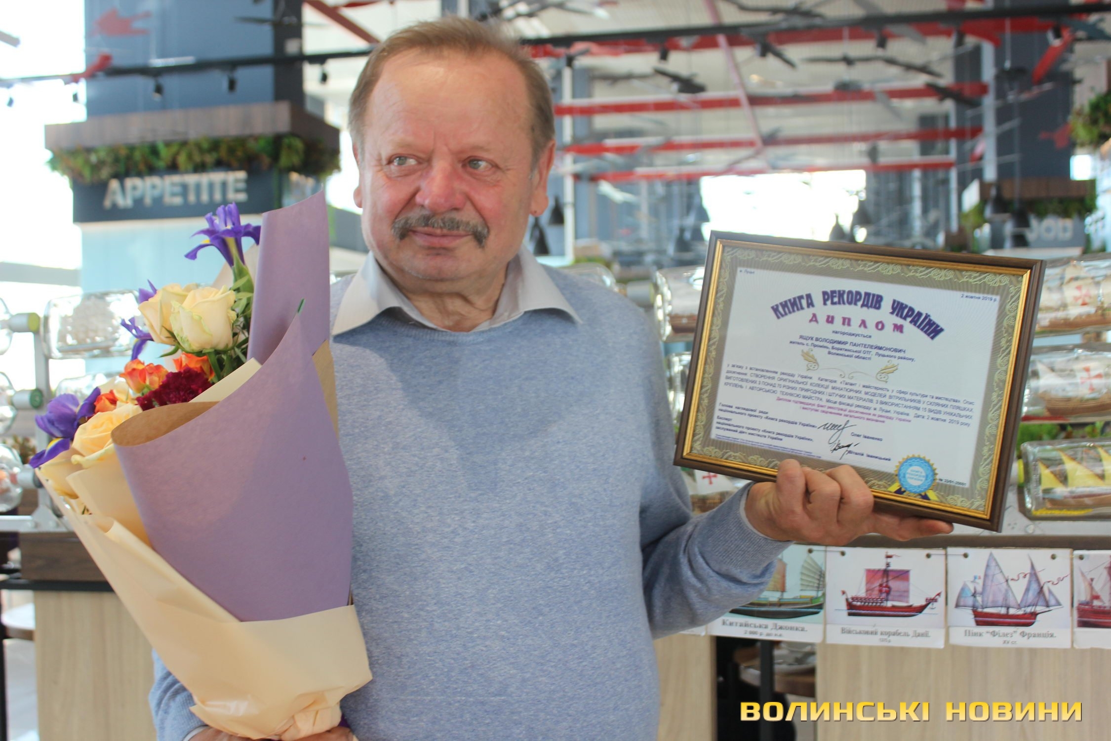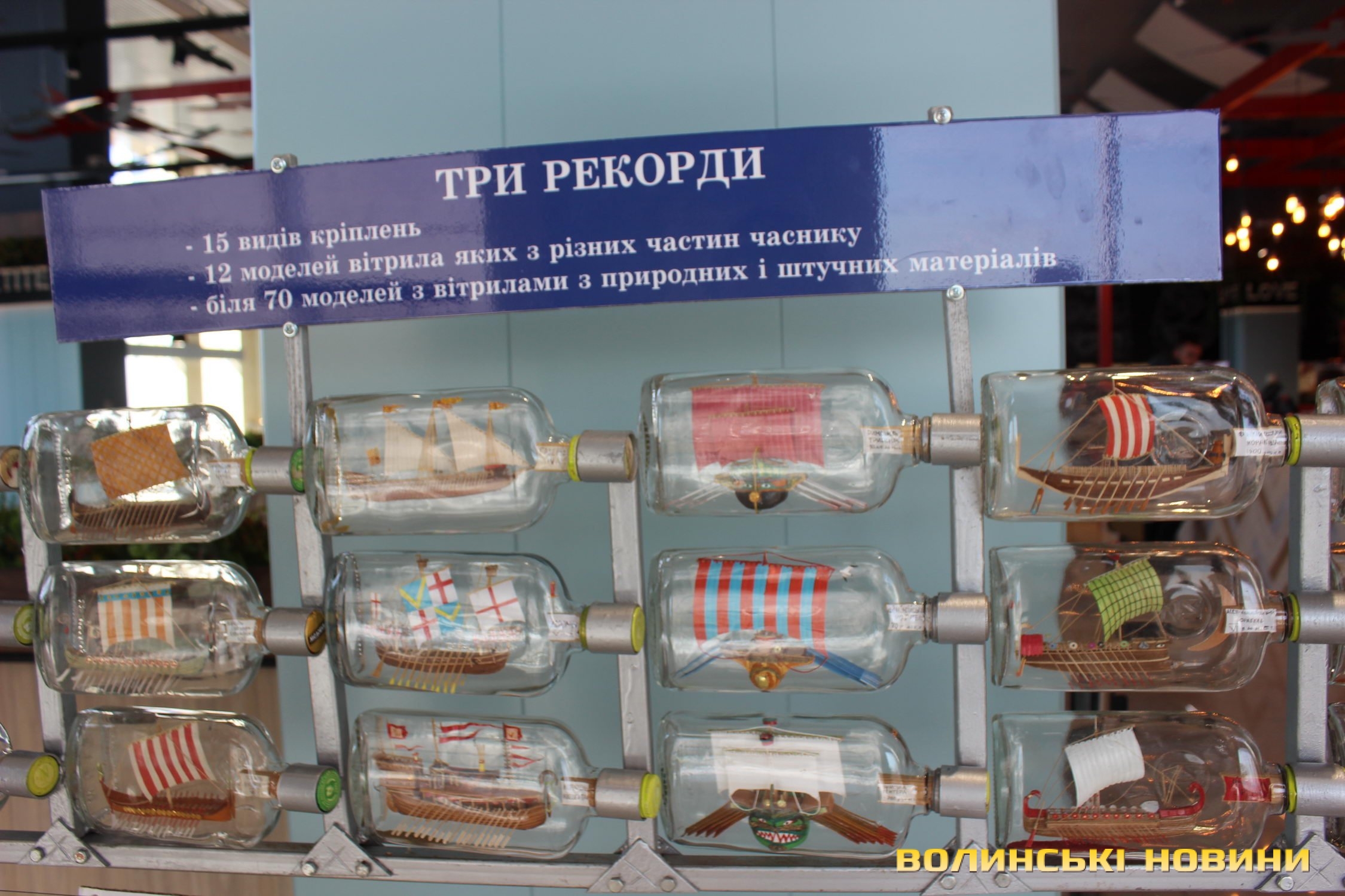 «Нагороджується Ящук Володимир Пантелеймонович, житель села Промінь Боратинської ОТГ Луцького району Волинської області, у зв’язку із встановленням рекорду України. Категорія «Талант і майстерність у сфері культури та мистецтв». Опис досягнення: створення оригінальної колекції мініатюрних моделей вітрильників у скляних пляшках, виготовлених з понад 70 різних природних і штучних матеріалів, з використанням 15 видів унікальних кріплень і авторською технікою майстра», – вказано на дипломі Книги рекордів України, котрий вручили автору.Як пригадав майстер, поштовхом до незвичного захоплення став випадок, коли товариш звернув його увагу на світлину вітрильника в пляшці, розміщену в журналі «Вокруг света». Володимир Ящук сказав, що це не так і важко зробити, а згодом мусив підтверджувати свої слова. З того часу й виготовляє кораблики, які вміщує до скляних пляшок.