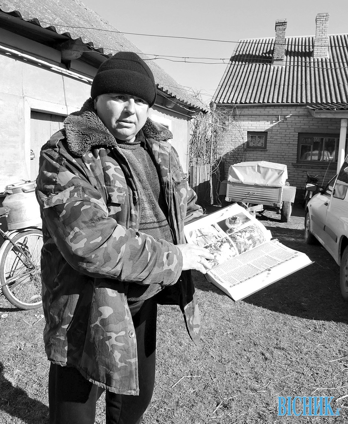 – Треба багато читати, тому й роблю собі закладки, щоб набути досвіду, – пояснює. – Наприклад, варикоз ніг, – швиденько гортає сторінки, – корінь лопуха настояти на горілці тиждень, щоб рідина стала коричневою. Лягаєте спати, натираєте – і вени ховаються. А таких рецептів тут багато, аж на 700 листків! Ще після школи я закінчив у сільськогосподарській академії ветеринарну медицину – ото усі мої знання. Тому треба вчити анатомію, хоча розташування внутрішніх органів знаю.